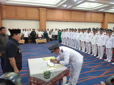 Bupati Rokan hulu Sukiman kukuhkan perpanjangan masa jabatan Kepala Desa se Kabupaten Rokan hulu Riau tahun 2024, dari 6 tahun menjadi 8 tahun yang dipusatkan di Convention hall Masjid Islamic Center Pasir pengaraian, Rabu (17/7/2024). (Dok. Kominfo Rohul)
