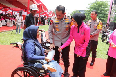 Kemudian untuk alat bantu jalan berupa kursi roda, diberikan kepada Novianti (43), warga Talang Jambe, Kecamatan Sukarami, dan M Yahya Ujang (71), warga Sungai Lais, Kecamatan Kalidoni. Khusus Novianti, juga mendapat tambahan kaki palsu. Sebab kaki kirinya terpaksa diamputasi, karena kecelakaan lalu lintas yang dialaminya. Sembari pengundian ratusan hadiah doorprize lainnya, Ketua Bhayangkari Daerah Sumsel Ny Dewwy Andi Rian dan Wakil Ketua Ny Monika Zulkarnain, dan pengurus lainnya, meninjau booth bakti kesehatan dan UMKM.