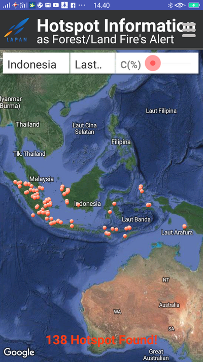 Menurut keterangan Kepala Pusat Data Informasi dan Humas BNPB, Sutopo Purwo Nugroho siang tadi, terdata pemantauan titik hotspot hasil pemantauan 24 jam terakhir dari satelit Aqua, Terra, SNNP pada catalog modis LAPAN tanggal 26 Juli 2018 pukul 07.15 WIB dengan kategori sedang (30-79 persen) dan tinggi (>=80 persen).