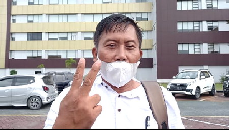 Ketum DPP LSM Perisai Riau Sunardi SH mengacungkan dua jari tangan kanannya menjelaskan bahwa sudah ada dua alat bukti diserahkan ke Penyidik Polda Riau tapi kenapa pengusaha kaya Riau, Meryani belum juga ditindaktegas, ada apa?