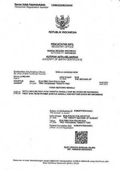 Di Akte Lahir Nama: Yosia Geovano Manalu, Nama Ayah Saritua Manalu. Nama Ibu Dosni Br Sihombing, alamat rumah kita Gang Sibayak, Dusun II, Desa Rumah Berastagi, Kecamatan Berastagi, Kabupaten Karo, Sumatera Utara.