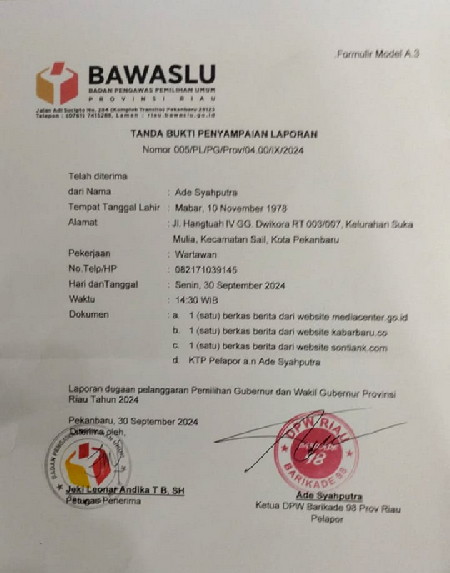 Laporan Nomor 005/PL/PG/Prov/04.00/IX/2024 tertanggal 30 September 2024 yang dilaporkan oleh Ketua DPW Barikade 98 Riau, Ade Syahputra.