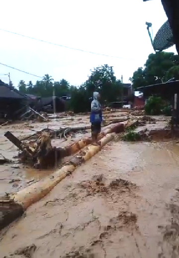 Kayu-kayu besar dan kecil tumbang hanyut disapu banjir bandang dan menghantam rumah warga. Air dan lumpur masuk ke rumah warga.