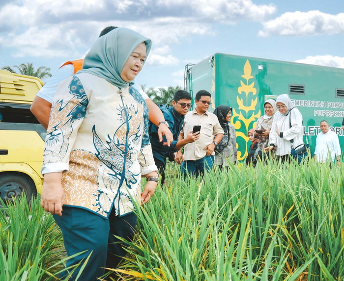 Deputi Bidang Koordinasi Keterjangkauan dan Keamanan Pangan Dr Ir Nani Hendiarti MSc saat meninjau perkembangan lokasi pilot project program Tampan yang diinisiasi PTPN IV di Kabupaten Siak, Provinsi Riau, mengatakan tanaman padi gogo di sela-sela hamparan sawit muda itu merupakan wujud nyata dukungan BUMN Perkebunan dalam mewujudkan program swasembada pangan nasional pada 2027 mendatang.