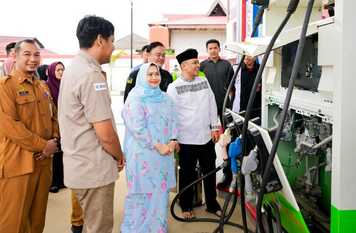 Bengkalis, Detak Indonesia--Bupati Bengkalis Riau Kasmarni bersama Wakil Bupati Bagus Santoso langsung memantau takaran pengukuran Bahan Bakar Minyak (BBM) di salah satu SPBU Jalan Jenderal Sudirman Lintas Timur, Kecamatan Bathin Solapan, Kabupaten Bengkalis, Provinsi Riau, Selasa (18/3/2025).