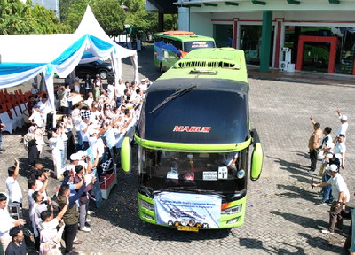 Nampak raut wajah bahagia terpancar dari para pemudik yang telah membayangkan dapat segera berkumpul di kampung halaman pada saat pelepasan secara resmi yang dilangsungkan dari PTPN IV Regional III, Kota Pekanbaru, Riau.