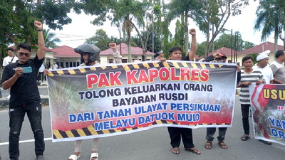 Bangkinang, Detak Indonesia--Ratusan warga dari Persukuan Melayu Datuok Mudo seberang Bangkinang Kabupaten Kampar Riau berunjukrasa ke Mapolres Kampar di Kota Bangkinang, Rabu (23/4/2025).