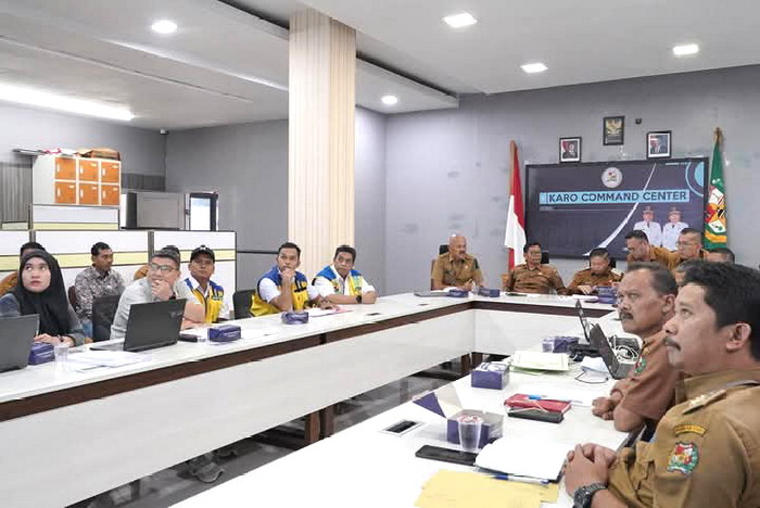 Kabanjahe, Detak Indonesia--Wakil Bupati Karo, Komando Tarigan SP ikuti rapat percepatan kegiatan penanganan banjir daerah irigasi Paya Lah Lah Kabupaten Karo secara zoom meeting di ruang Karo Command Center (KCC) Dinas Komunikasi dan Informatika Kabupaten Karo, Jalan Letjen Jamin Ginting No. 17 Kabanjahe, Provinsi Sumatera Utara, Selasa, (29/4/2025).