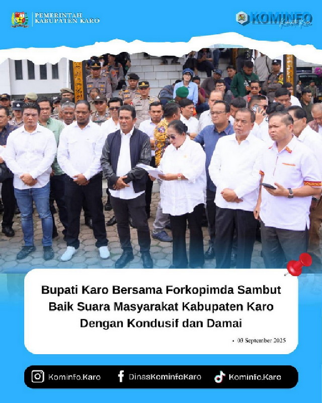 Kabanjahe, Detak Indonesia--Pemerintah Kabupaten Karo menyampaikan apresiasi yang tinggi atas pelaksanaan aksi penyampaian aspirasi oleh masyarakat yang berlangsung secara damai, tertib, dan penuh kekeluargaan, di Kabanjahe, Provinsi Sumatera Utara, Rabu,(3/9/2025).