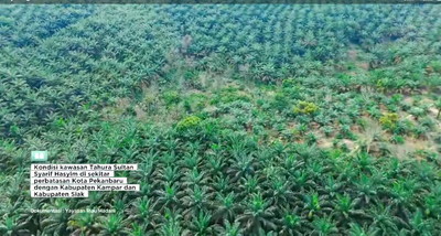 Taman Hutan Raya Sultan Syarif Hasyim (Tahura SSH) yang seharusnya hamparan hutan alam, sudah berubah menjadi hamparan kebun sawit ilegal ribuan hektare belum ditindak Dinas Kehutanan Riau dan Kejaksaan Tinggi Riau. (Dok. Yayasan Riau Madani)