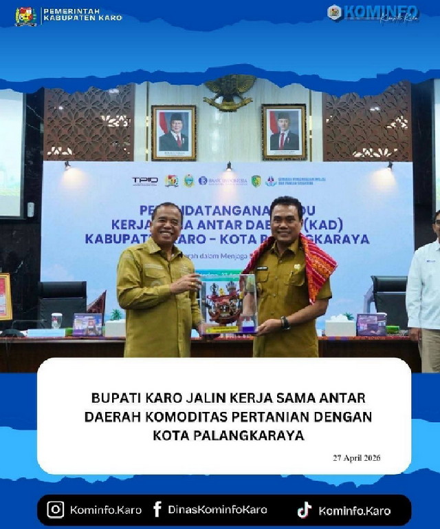 Medan, Detak Indonesia--Pemerintah Kabupaten Karo resmi menjalin kerja sama antar daerah dengan Pemerintah Kota Palangkaraya dalam pengembangan dan distribusi komoditas hasil pertanian. Kegiatan ini dilaksanakan di Kantor Perwakilan Bank Indonesia Provinsi Sumatera Utara, Senin (27/4/2026).