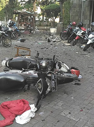 Kabid Humas Polda Jawa Timur Kombes Frans Barung mengatakan ada kejadian di Jalan Diponegoro, GKI dan Santa Maria di tiga TKP. Di Santa Maria ada korban yang tewas. Kejadian ini tidak bersamaan tapi berentetan.