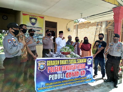 Bangunjaya, Detak Indonesia-- Kapolsek Tambusai Utara, Kabupaten Rokanhulu (Rohul) Riau, Iptu D RaJa Putra Napitupulu SIK bersama Kades Bangunjaya, Yusrianto (ocu), dan Bhabinkabtinmas Bripka Sihaimi Hamid serahkan bantuan peduli covid-19 kepada masyarakat berupa ikan lele, jagung dan kangkung, Jumat (15/5/2020).