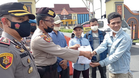 Mereka diterima di pintu gerbang depan Mapolda Riau Jalan Pattimura Pekanbaru oleh perwakilan Polda Riau Kompol Pol Harutkemri.